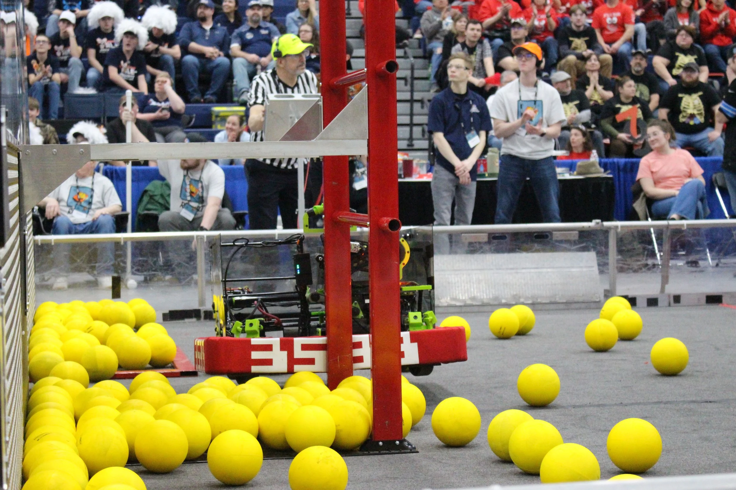 This year, our game operates in 30-second intervals. This means that your team can only score during half of the match. During the other half of the time, your hub (the place where you score) is inactive. When your hub is inactive, any fuel (the balls) scored are considered void. In a team’s off time, they can defend the other team’s hub and/or try to stop them from collecting fuel. At any point during the teleop period, human players can deposit fuel into the active hub with no limit on how much they can score. At the end of Teleop, they can climb their alliance’s tower to get points.